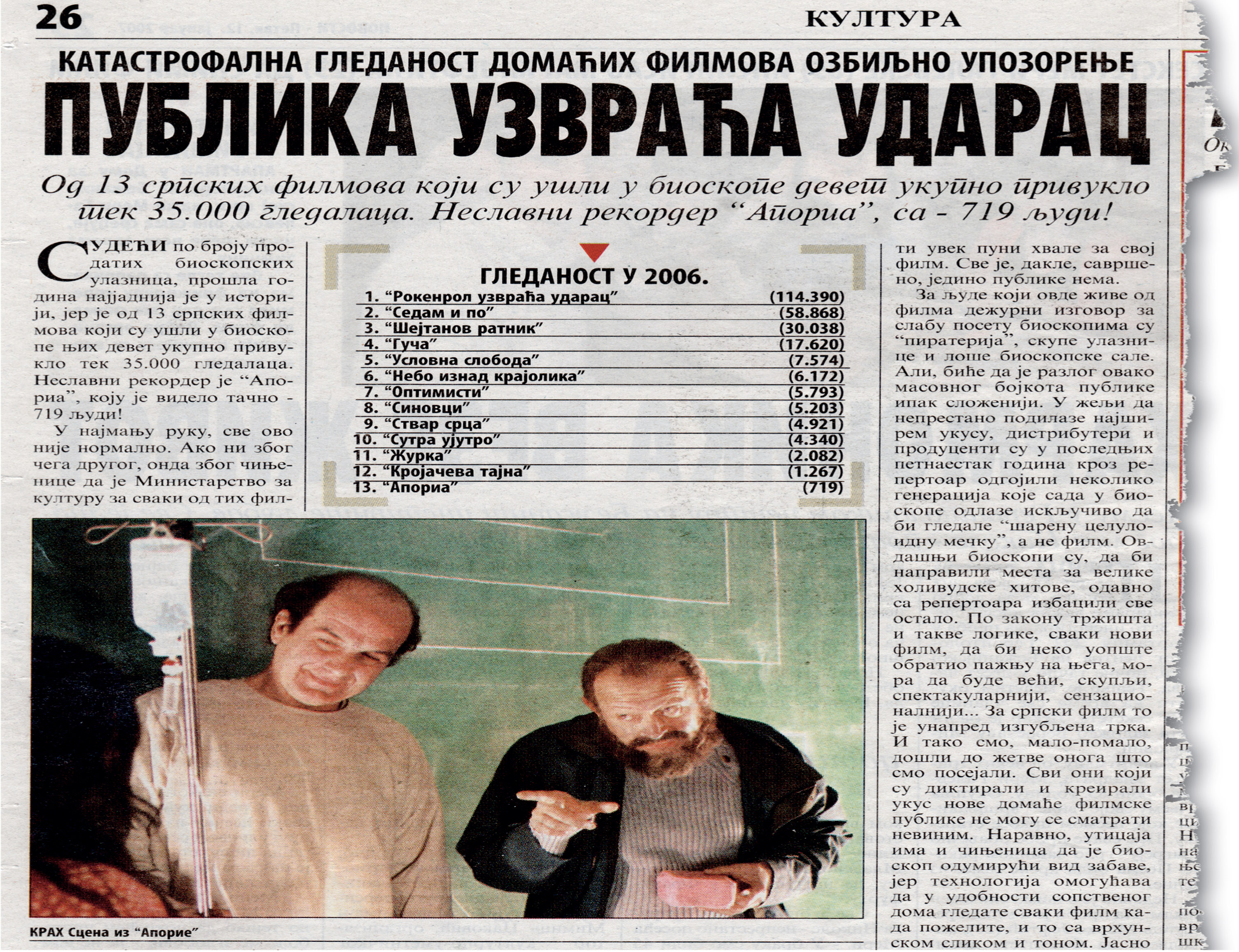 Najozbiljnija opomena došla je, međutim, od publike. Oduvek najverniji saveznik srpskog filma, spremna da srčano podrži uspehe, ali i da strpljivo guta promašaje i lutanja, naša bioskopska publika sasvim jasno je pokazala da je se takav film ne tiče i da više neće da ga gleda. Ono na šta smo u “Filmografu” više puta upozoravali, dogodilo se početkom godine, kada je jedan beogradski dnevnik saopštio katastrofalne podatke o poseti, upravo u vreme kada beogradski bioskopi ponovo otvaraju vrata, svesni da pomoć ne može doći niotkud. Taj članak, donosimo kao prilog, u faksimilu, podsećanja radi na uzroke kolapsa.